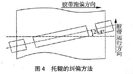 c) 托辊组轴线同输送带中心线不垂直,造成输送带跑后不跑前现象,即输送带向后跑偏(与输送带的运行方向相反),调整方法为向哪边偏移,就将哪边的托辊向输送带前进的方向偏斜2°~4°(见下图),一般情况下要调整几个托辊才可以纠偏。