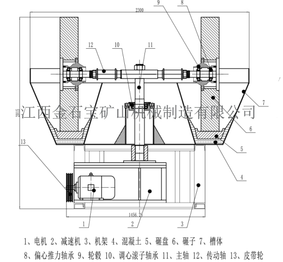 该设备主要由动力装置、机架、水盆、碾轮、碾盘等部件组成,采用轮动式磨矿工作方式:首先电动机将动力传动至减速机,在减速机带动下,通过大立轴将力矩传递给上方的横轴,然后经安装在横轴两端的拉杆传递至碾轮,使碾轮产生驱动力,沿横轴水平方向做逆时针旋转运动;工作时的碾轮既能围绕湿碾机大立轴公转,又能围绕碾轮中心轴进行自转,碾盘则固定不动。添加的矿石物料,在碾磨机内受到来自,碾轮自身重量带来的挤压力,碾轮公转自转时与碾盘产生的巨大摩擦力,在受到反复的挤压、揉搓、研磨后,被彻底粉碎。