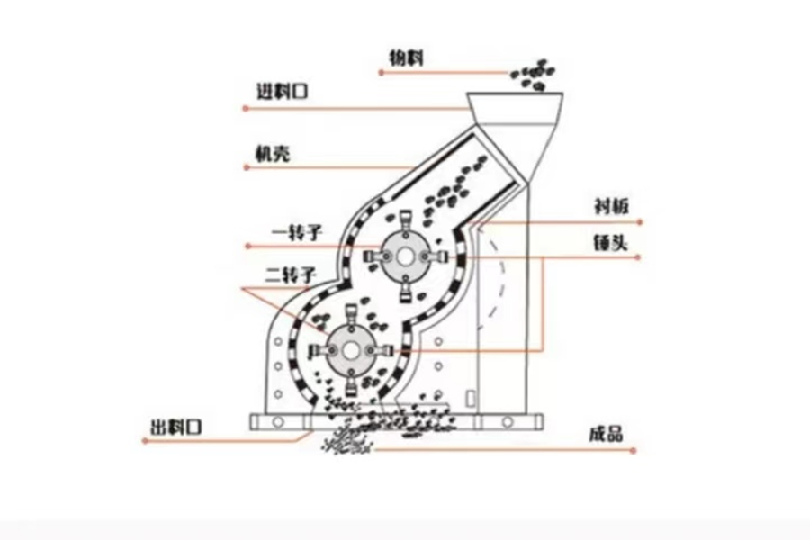 两台锤破合二为一,合理的组合成一个整体,两套转子串连使用。